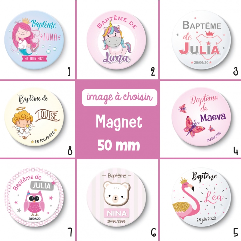 Magnet personnalisable rond format 50 mm pour garder un souvenir d'un baptême ou l'anniversaire d'une petite fille.