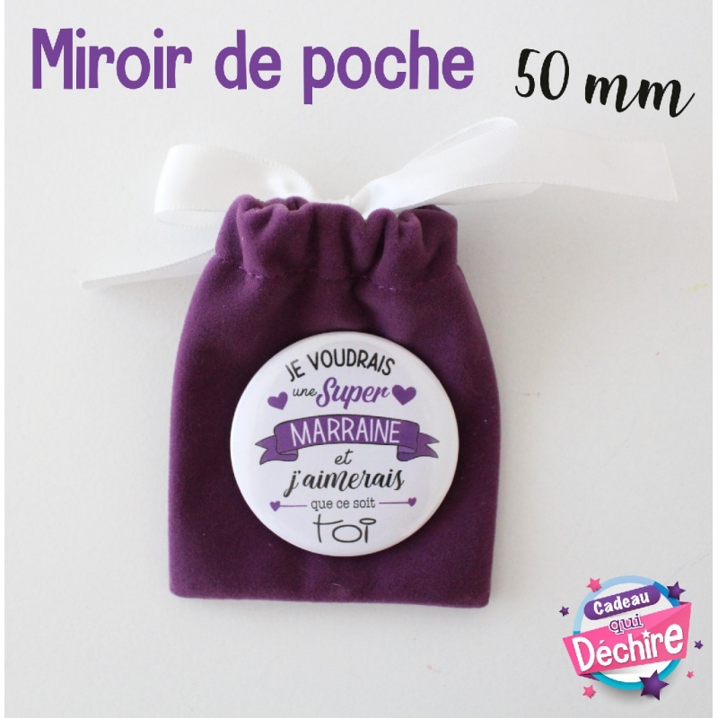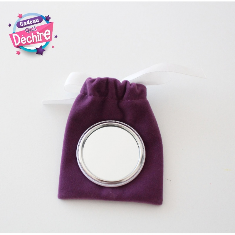Miroir de poche de 50 mm avec son petit pochon violet pour le ranger et à emporter partout sur soi.
