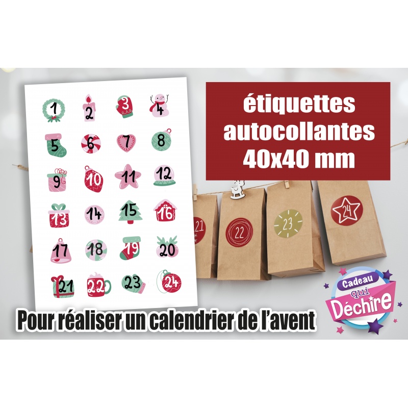 Réaliser un calendrier de l'avent sous forme de sachet ou en bois, avec cette planche d'étiquettes autocollantes à coller directement sur votre support.