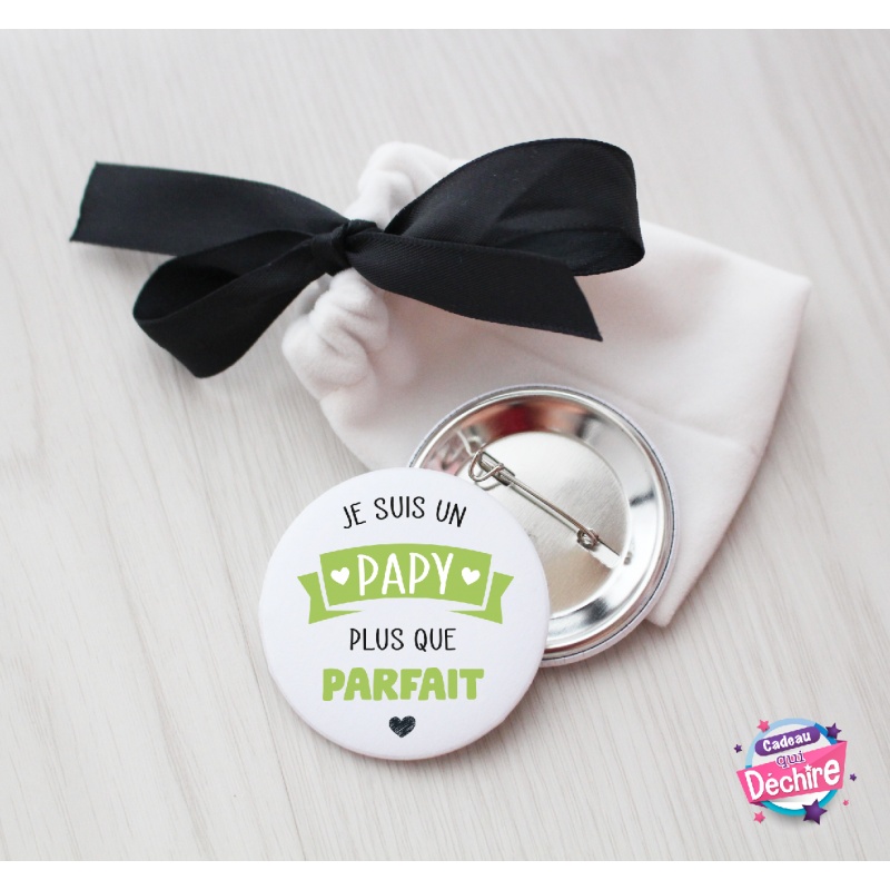 Badge épingle 50 mm à attacher partout (veste, blouse, trousse, cartable, sac...), fourni avec un sachet en velours pour offrir.