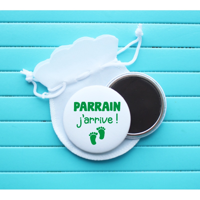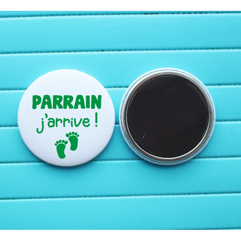 Magnet rond format 50 mm à offrir pour annoncer une grossesse au futur parrain.