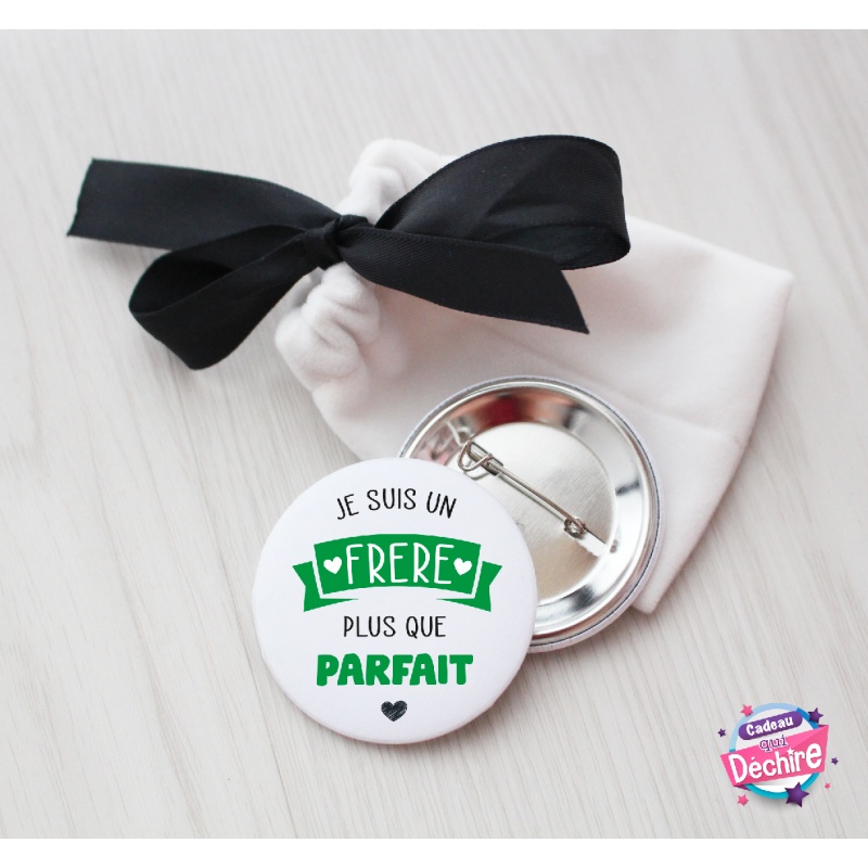 Badge épingle 50 mm à attacher partout (veste, blouse, trousse, cartable, sac...), avec son sachet en velours pour offrir.